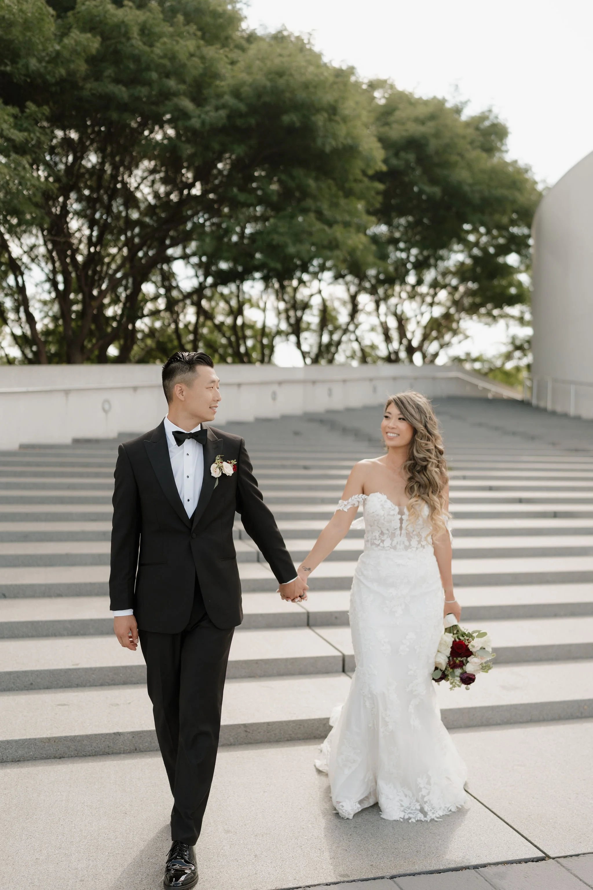 Modern architecture met timeless romance in the best way possible. Lily’s stunning silhouette highlighted by an exquisite lace train, brought a touch of classic elegance to the clean, contemporary backdrop. Her joyous anticipation was unmistakable, caught in a fleeting, mirrored reflection. Edan complimented the aesthetic flawlessly in a classic black tuxedo. Together, their individual portraits felt less like traditional wedding photography and more like a high-fashion editorial spread.